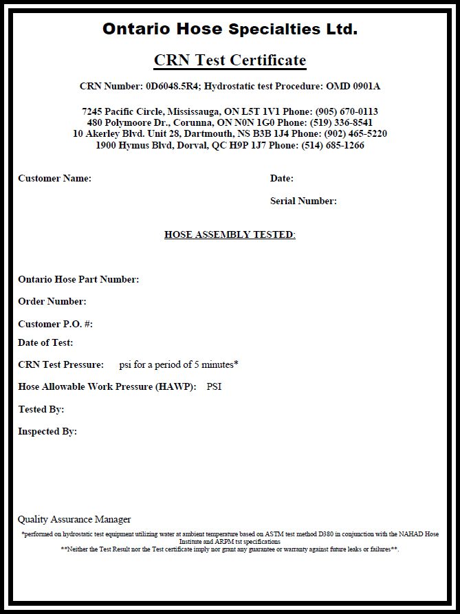 CRN stands for Canadian Registration Number, administered by TSSA (Technical Standards and Safety Authority). It is required for hoses used in service over 15 psi pressure and attached to a registered piping system. CRN certification treats hose assemblies as pressure vessels.
